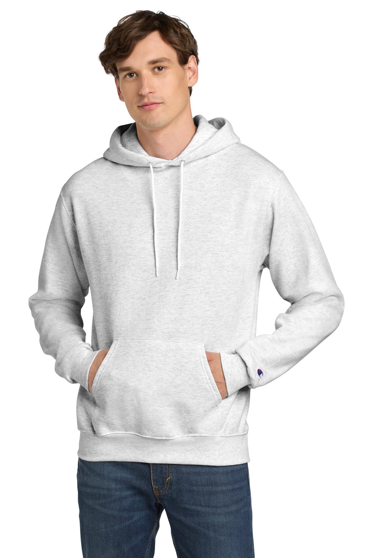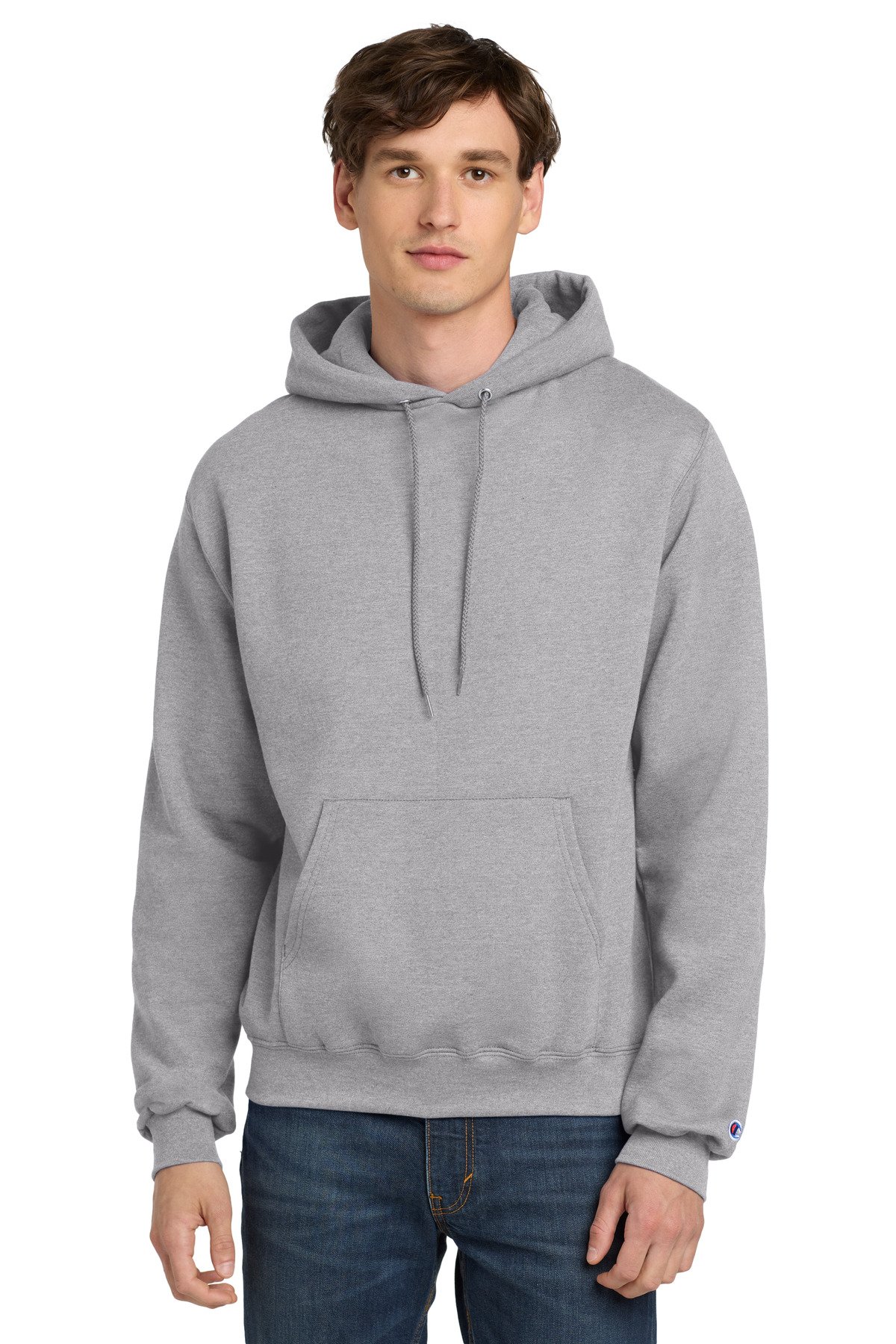 9-ounce, 50/50 U.S. grown cotton/poly 50/40/10 cotton/poly/black poly (Light Steel) 50/48/2 cotton/poly/black poly (Silver Grey) Double Dry technology wicks moisture Two-ply hood with dyed-to-match drawcords 1×1 rib knit sleeve cuffs and hem Front pouch pocket Embroidered Champion ‘C’ logo at left cuff Woven back neck label