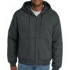 Tough enough to do the job, this work jacket layers easily over shirts and jackets so it’s great for mild or harsh weather. | 12-ounce, 100% cotton duck cloth 100% nylon dyed-to-match lining with 6-ounce polyfill insulation (Duck Brown has black lining) Hood with dyed-to-match drawcord Rib knit cuffs and waistband Front hand warmer pockets Interior pocket Decoration access pocket