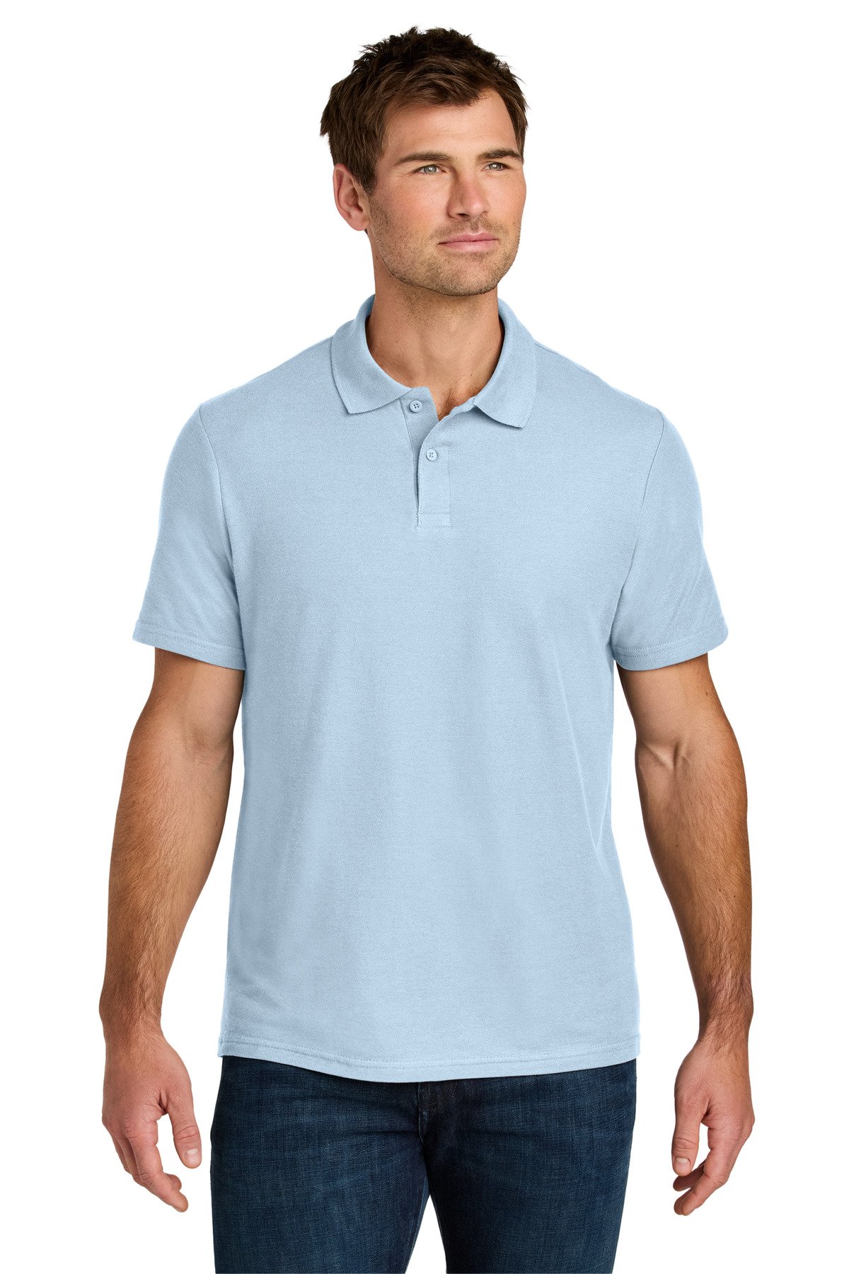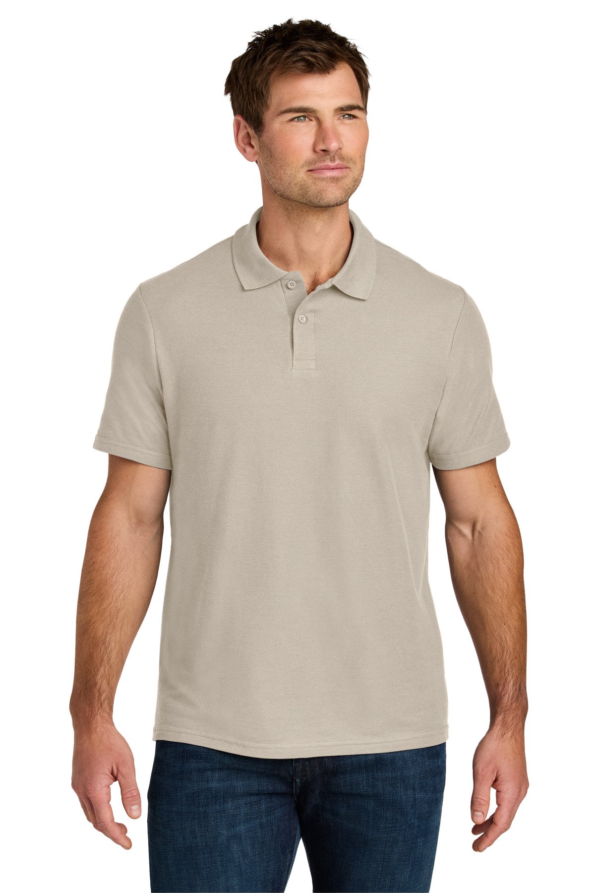 5.2-ounce, 100% ring spun cotton 90/10 ring spun cotton/poly (Ring Spun Sport Grey) Rolled forward shoulders Clean-finished placket Dyed-to-match buttons Modern classic fit, side seamed Recycled, high-performing black tear-away label