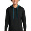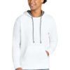 5.3-ounce, 60/40 combed ring spun cotton/polyester French terry fleece Tear-away label Halfmoon at back neck Jersey-lined hood with dyed-to-match flat drawcords Reinforced grommets Side seamed 1×1 rib knit cuffs and hem