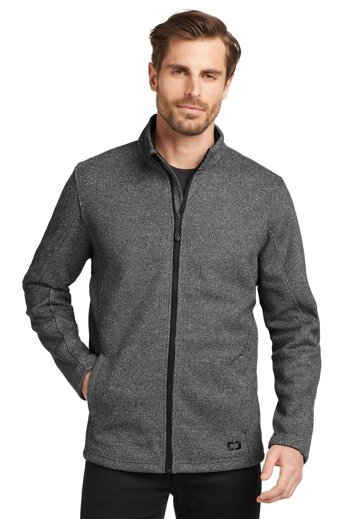 With a unique and rugged texture, this jacket shows real grit. Heavy gauge knit, an embossed lining and understated details give it a sharp take on utility and comfort. 12.4-ounce, 100% poly knit bonded to 100% poly brushed-back fleece Zip-through cadet collar OGIO heat transfer label for tag-free comfort OGIO locker loop Embossed lining with subtle O pattern Reverse coil zipper with OGIO zipper pull Embroidered O on front and back Front zippered pockets Open cuffs and hem