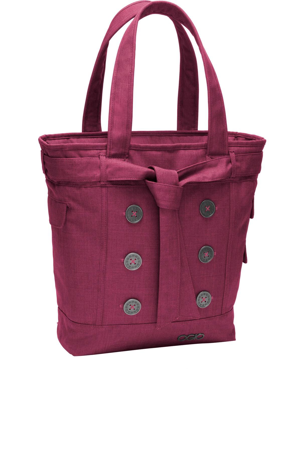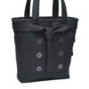 Large metal buttons give this feminine tote a classy look, while padded tech compartments make it perfect for work or school. | T/C 900D two-tone cotton/poly Top-entry padded laptop compartment Padded tablet/e-reader sleeve Three side flap pockets Fully padded base to protect laptop Large zippered interior compartment Two interior elastic side pockets for cords and beverage storage Interior zippered valuables pocket Removable decorative belt Easy-access deluxe organization panel with zippered pocket Padded grab handles Laptop sleeve: 14.5’h x 10.5’w x 1’d; fits most 15′ laptops Dimensions: 15’h x 16.5’w x 4’d Capacity: 1,000 cu.in./16L Weight: 1.6 lbs./0.62kg Bags not intended for use by children 12 and under.