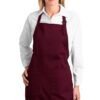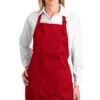 This apron gives you full-length protection. | 7-ounce,100% cotton twill with stain-release protection Two waist-level patch pockets, pen pocket 1-inch wide neck and waist ties, adjustable neck strap Measures 22’w x 30’l