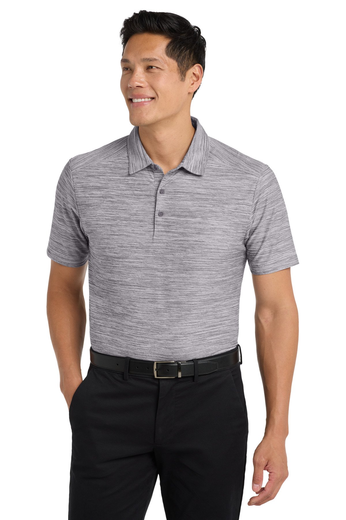 With an elevated heather look, this office-ready polo has plenty of stretch for unrestricted movement. With moisture wicking, this style also performs. 5.2-ounce, 93/7 poly/spandex drop needle jersey Self-fabric collar with collar stand Tag-free label 3-button placket Dyed-to-match buttons Self-fabric shoulder detail Open hem sleeves