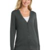 A soft, button-front cardigan to layer with a favorite tee or tank. | 4.4-ounce, 62/33/5 poly/rayon/spandex jersey knit Tag-free label Open Y-neck Dyed-to-match buttons