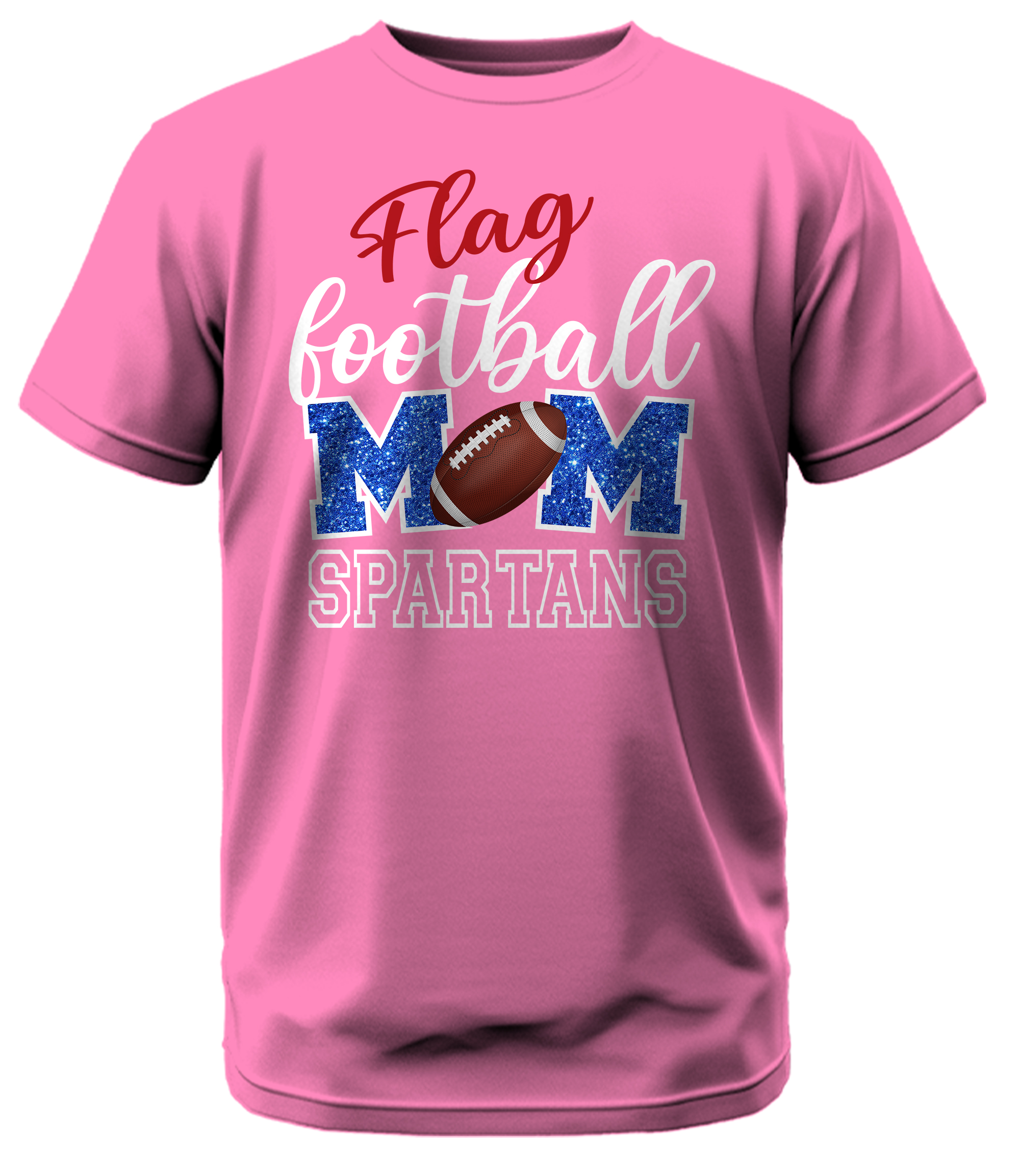 Show your pride and support for your favorite Spartans Flag Football team with this dazzling Mom T-Shirt! This custom-designed apparel features a glitter-infused design, giving you the perfect combination of comfort and style. Whether cheering from the sidelines or attending team events, this standout T-shirt ensures you represent your love for the sport with flair.